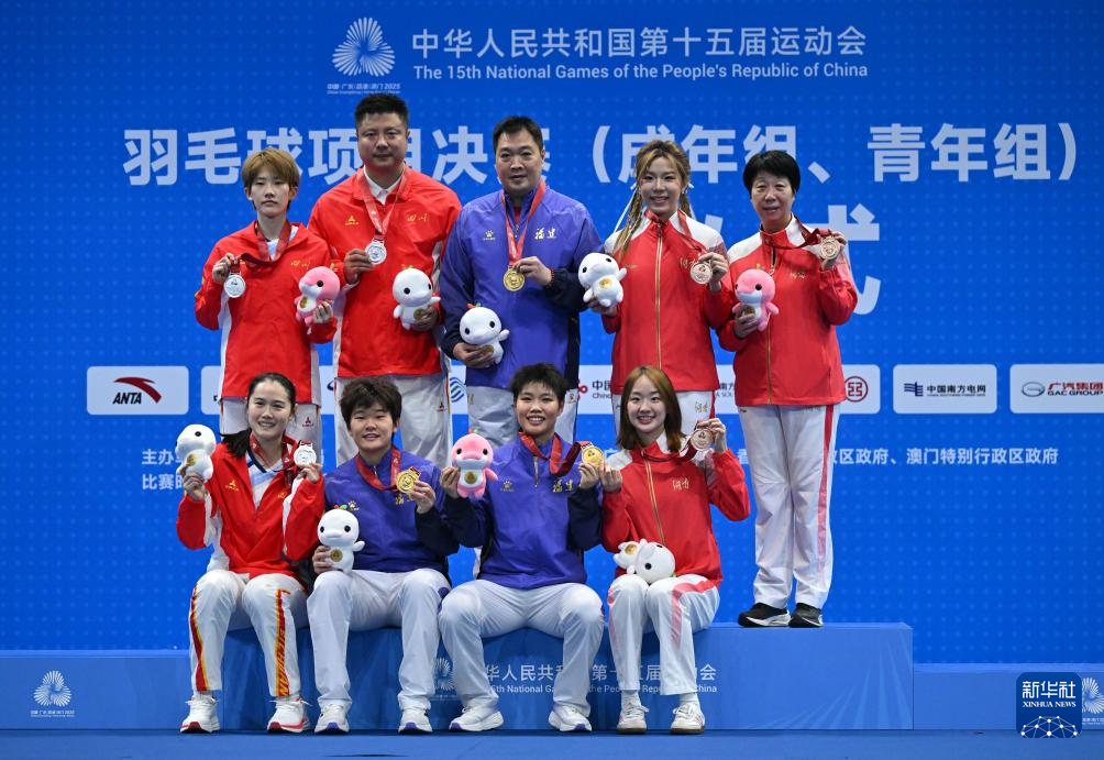 11月20日,冠军福建队组合黄东萍(下右二)/谭宁(下左二)、亚军四川队组合郑雨(下左一)/张殊贤(上左一)和季军湖南队组合贾一凡(上右二)/张驰(下右一)在颁奖仪式上。