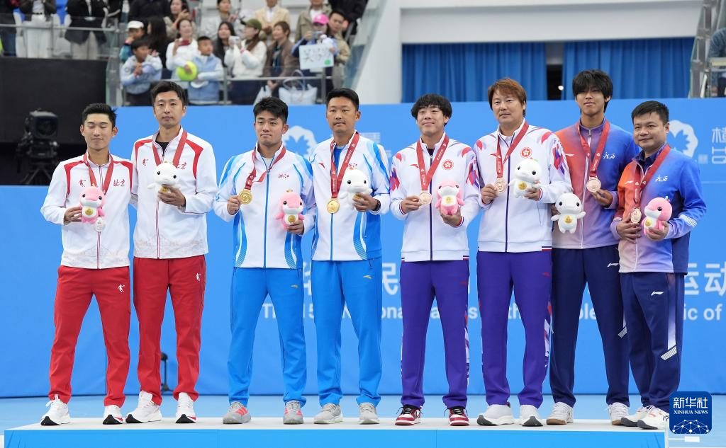 11月20日,获得冠军的浙江队选手吴易昺(左三)、获得亚军的北京队选手商竣程(左一)、获得季军的广西队选手周意(右二)和香港队选手黄泽林(右四)与教练一起在颁奖仪式上。
