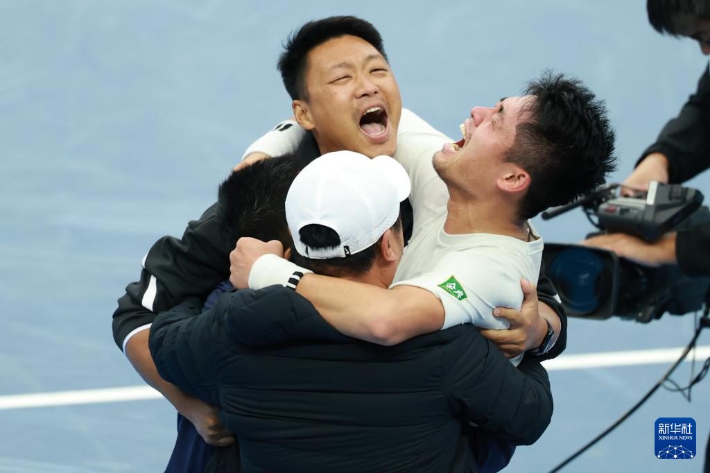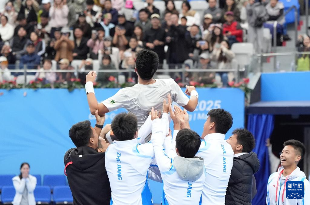 11月20日,浙江队选手吴易昺(右二)在赛后庆祝获胜。