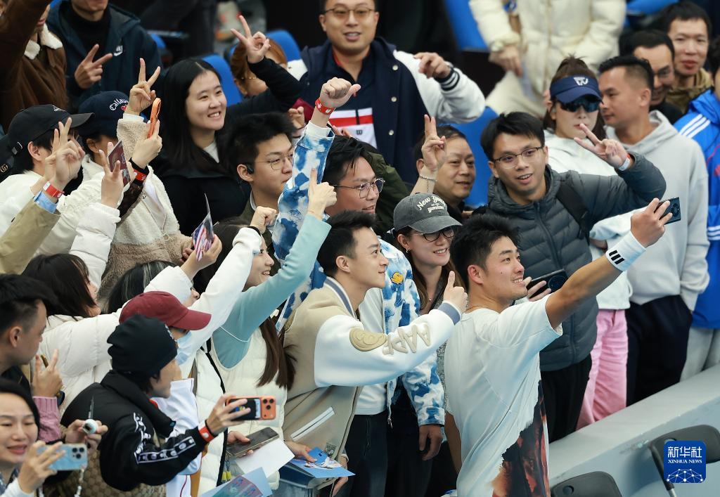 11月20日,浙江队选手吴易昺(前)在赛后与观众合影。