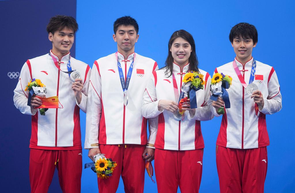 2021年7月31日,在东京奥运会男女混合4X100米混合泳接力决赛中,由徐嘉余、闫子贝、张雨霏、杨浚瑄(从左至右)组成的中国队获得银牌。新华社记者 许畅 摄