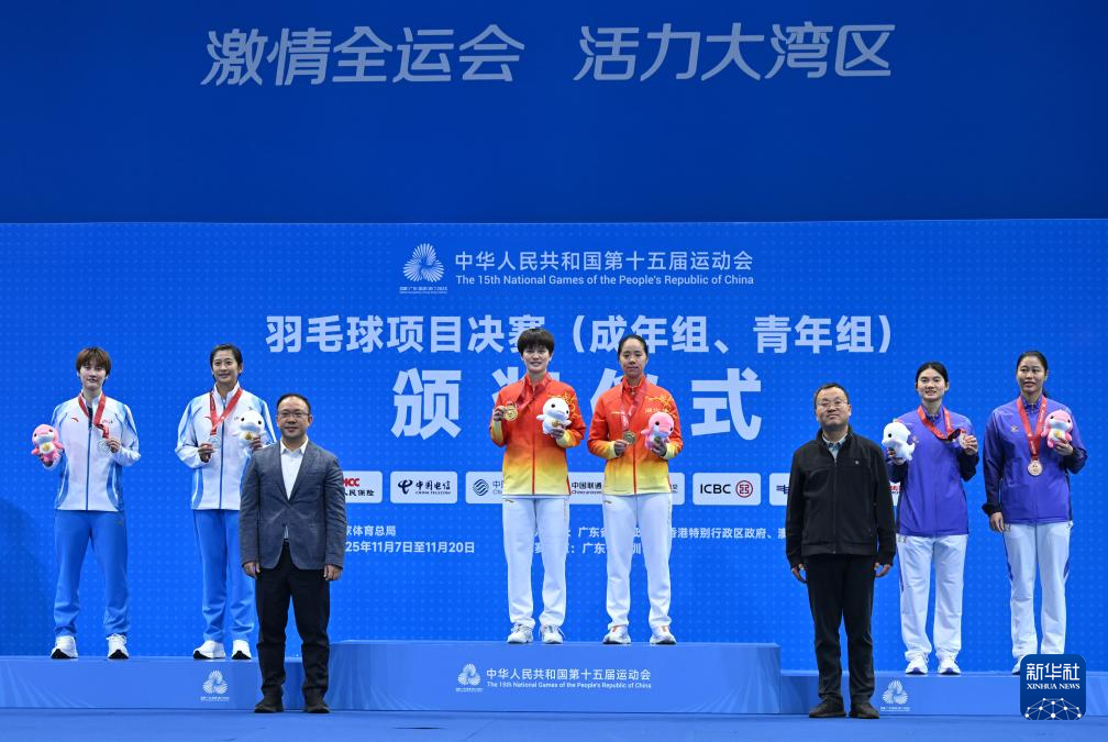 11月20日,冠军湖北队选手王祉怡(左三)、亚军浙江队选手陈雨菲(左二)和季军福建队选手韩悦(右二)和教练在颁奖仪式上合影。