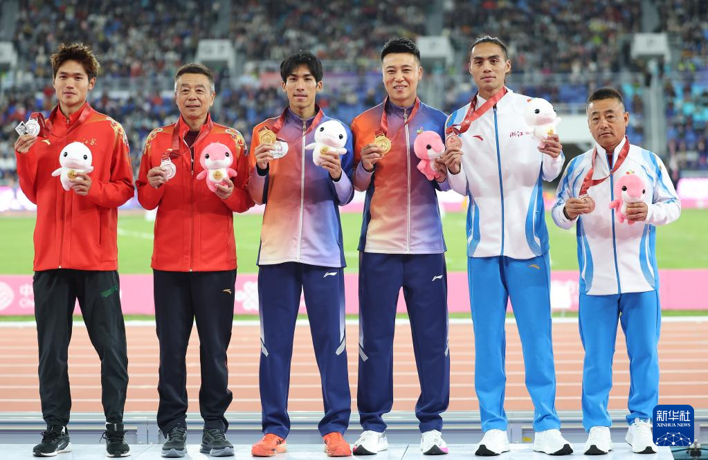 11月20日,获得冠军的广西队选手刘德助(左三)、获得亚军的江苏队选手陶沛林(左一)、获得季军的浙江队选手奚枭横(右二)在颁奖仪式上与教练合影。