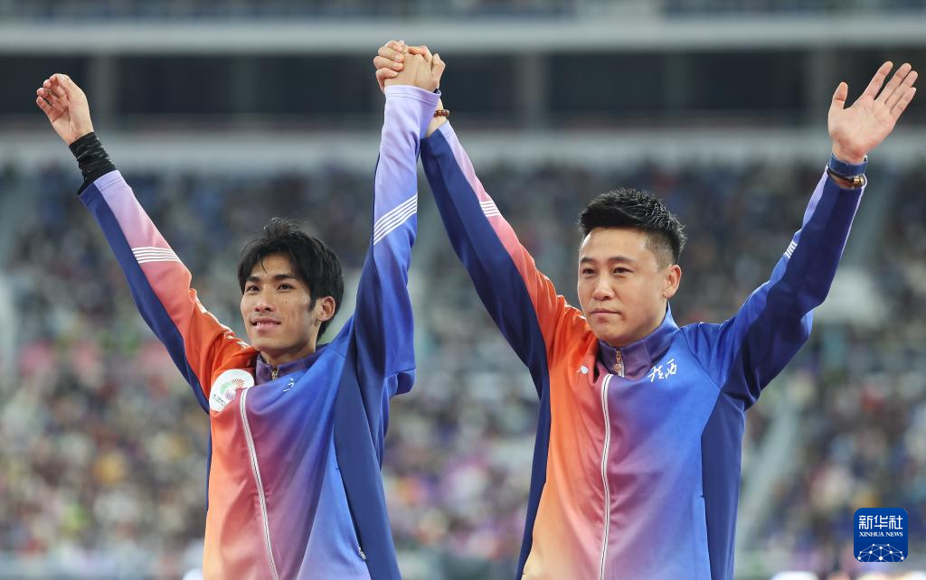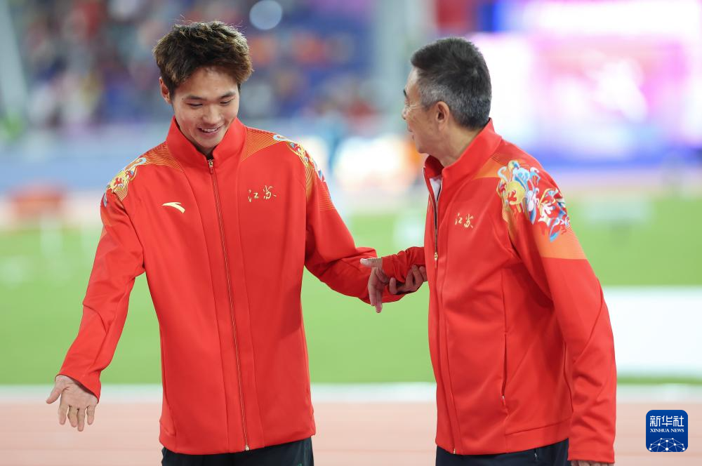 11月20日,获得冠军的广西队选手刘德助(左)与教练在颁奖仪式上。