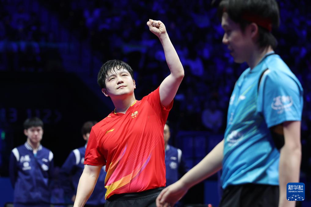 11月20日,上海队选手樊振东(左)在男单比赛后庆祝胜利。他3比1战胜北京队选手王楚钦。