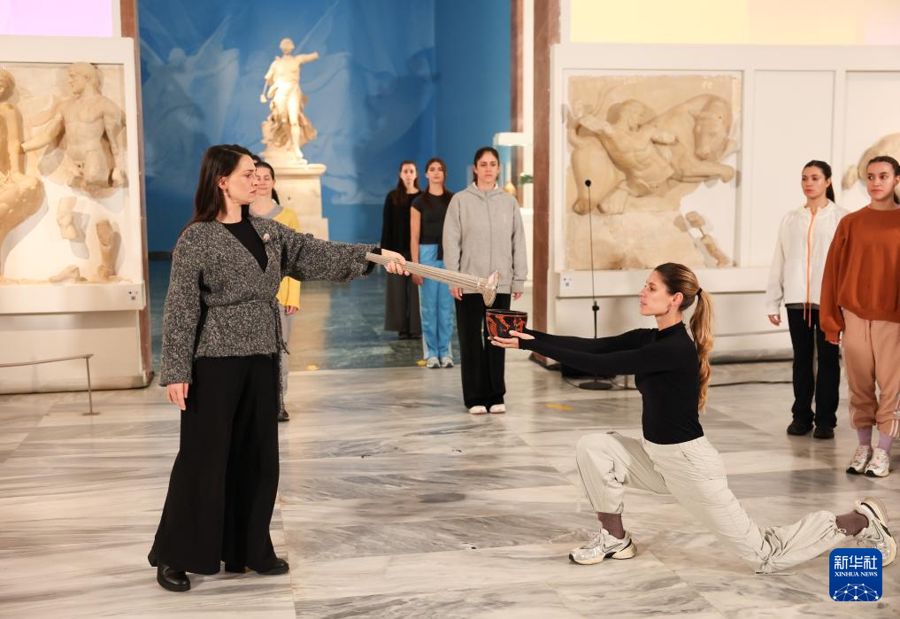 11月25日,扮演最高女祭司的演员玛丽·米娜(右)与第一棒火炬手、希腊运动员彼得罗斯在彩排中。