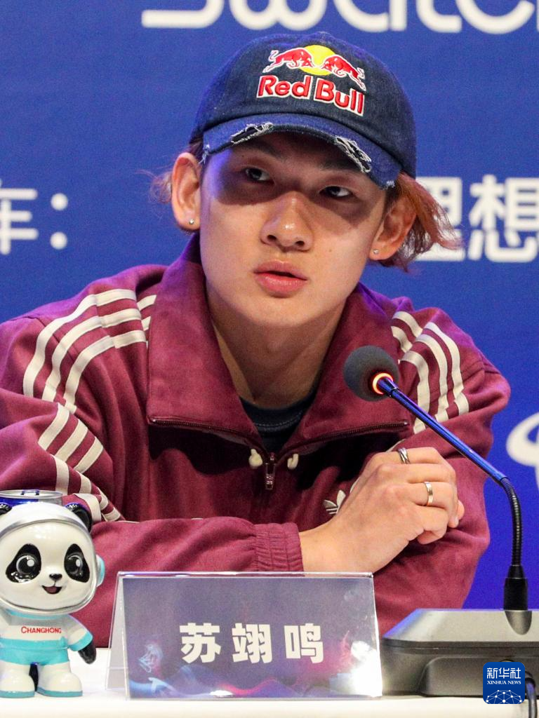 12月2日,中国单板滑雪运动员苏翊鸣在见面会现场回答记者提问。