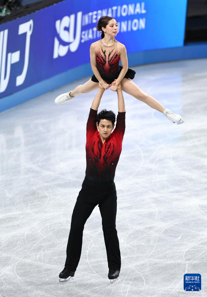12月4日,日本组合三浦璃来(上)/木原龙一在双人滑短节目比赛中。他们以77.32分的成绩暂列第一。