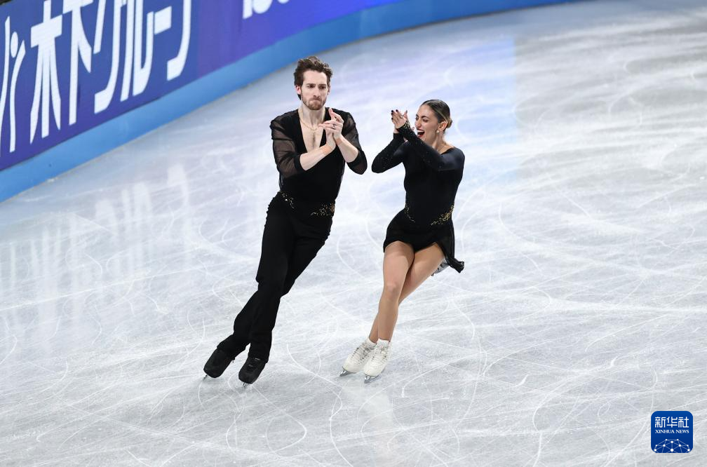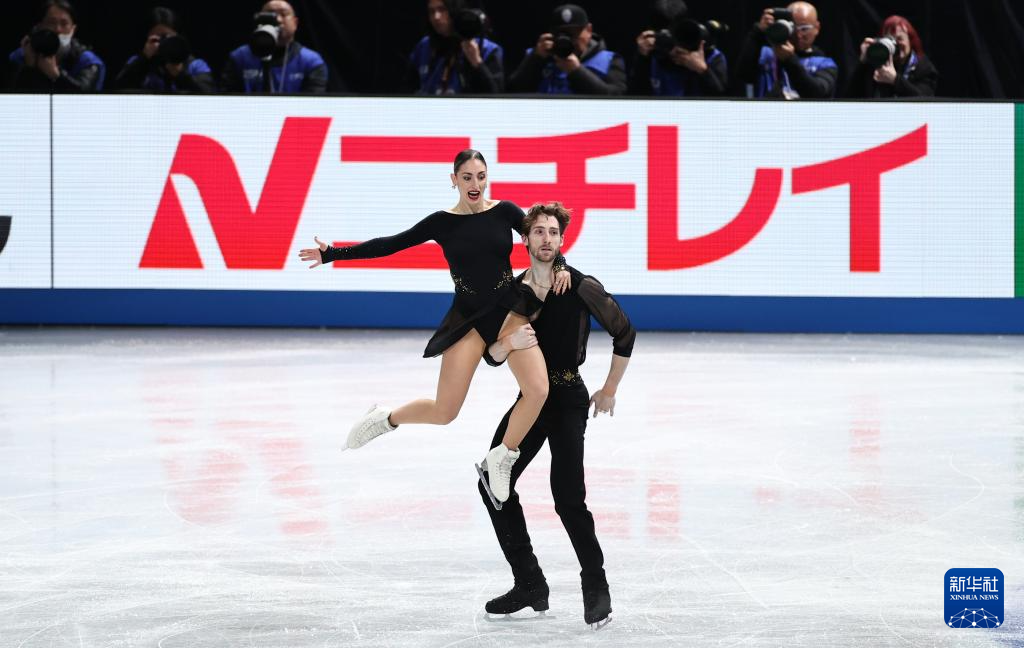 12月4日,日本组合三浦璃来(右)/木原龙一在双人滑短节目比赛中。他们以77.32分的成绩暂列第一。