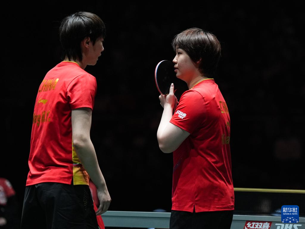 12月6日,中国队组合王曼昱(左)/蒯曼在比赛中商量战术。最终,她们在女双比赛中1比0战胜日本队组合张本美和/大藤沙月。
