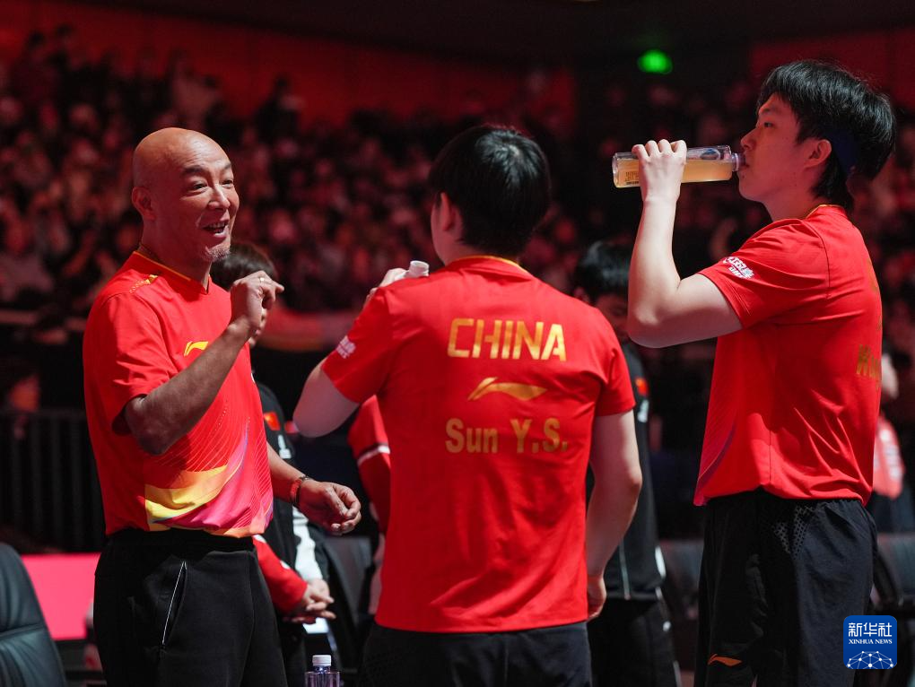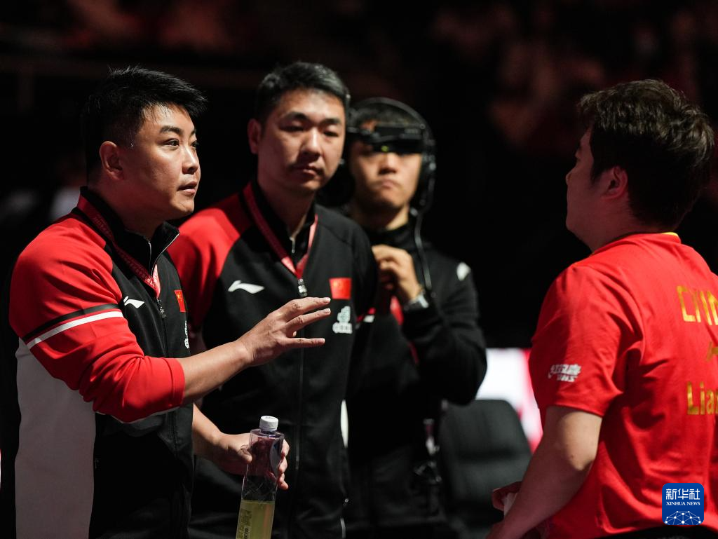 12月6日,中国队组合孙颖莎(中)/王楚钦(右)在比赛间隙接受教练肖战指导。最终,他们在混双比赛中3比0战胜日本队组合户上隼辅/张本美和。