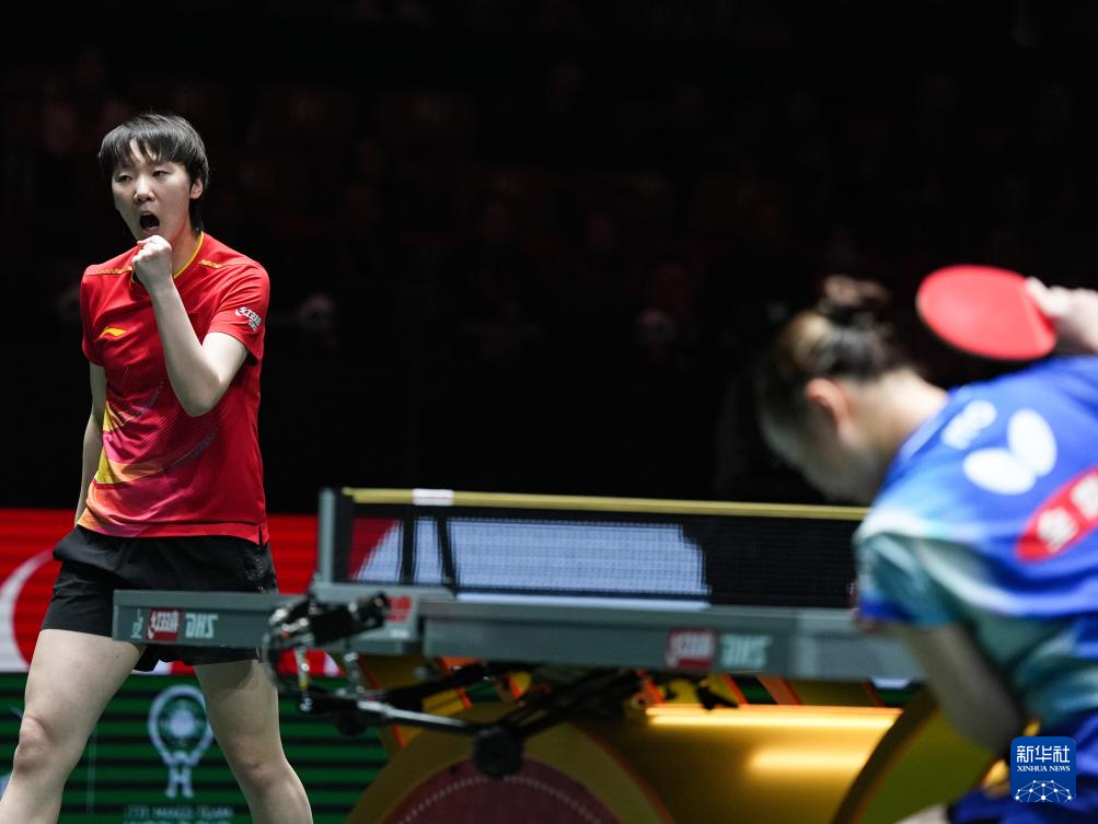 12月6日,中国队选手王曼昱庆祝胜利。最终,她在女单比赛中2比1战胜日本队选手伊藤美诚。