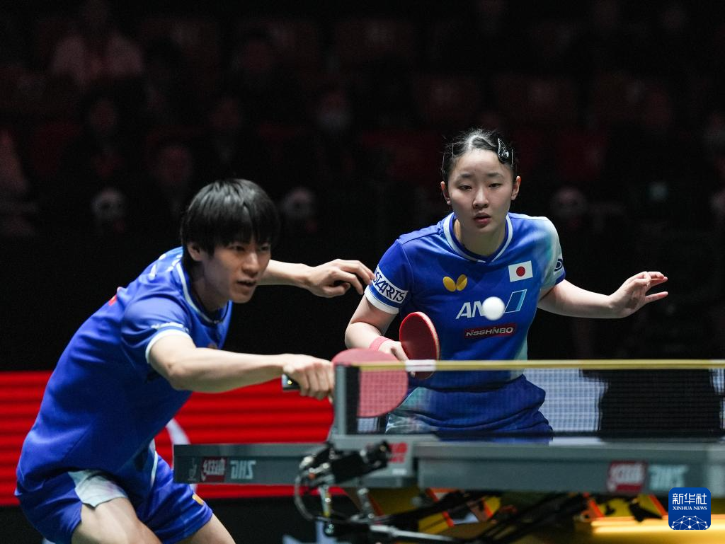 12月6日,日本队组合张本美和/户上隼辅(左)在比赛中。最终,他们在混双比赛中0比3不敌中国队组合孙颖莎/王楚钦。