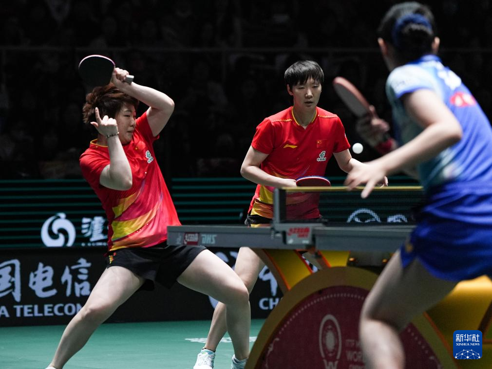12月6日,中国队组合王曼昱/蒯曼(左)在比赛中。最终,她们在女双比赛中1比0战胜日本队组合张本美和/大藤沙月。