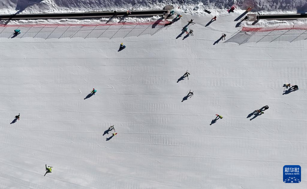 12月7日,在汶川羌人谷滑雪场,众多滑雪爱好者在雪道顶准备出发(无人机照片)。