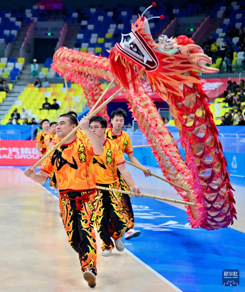 12月9日,演员在开赛仪式上进行舞龙舞狮表演。