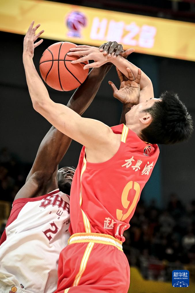 12月12日,浙江方兴渡队球员赵嘉仁(右)在比赛中与山西汾酒队球员法耶拼抢篮板球。
