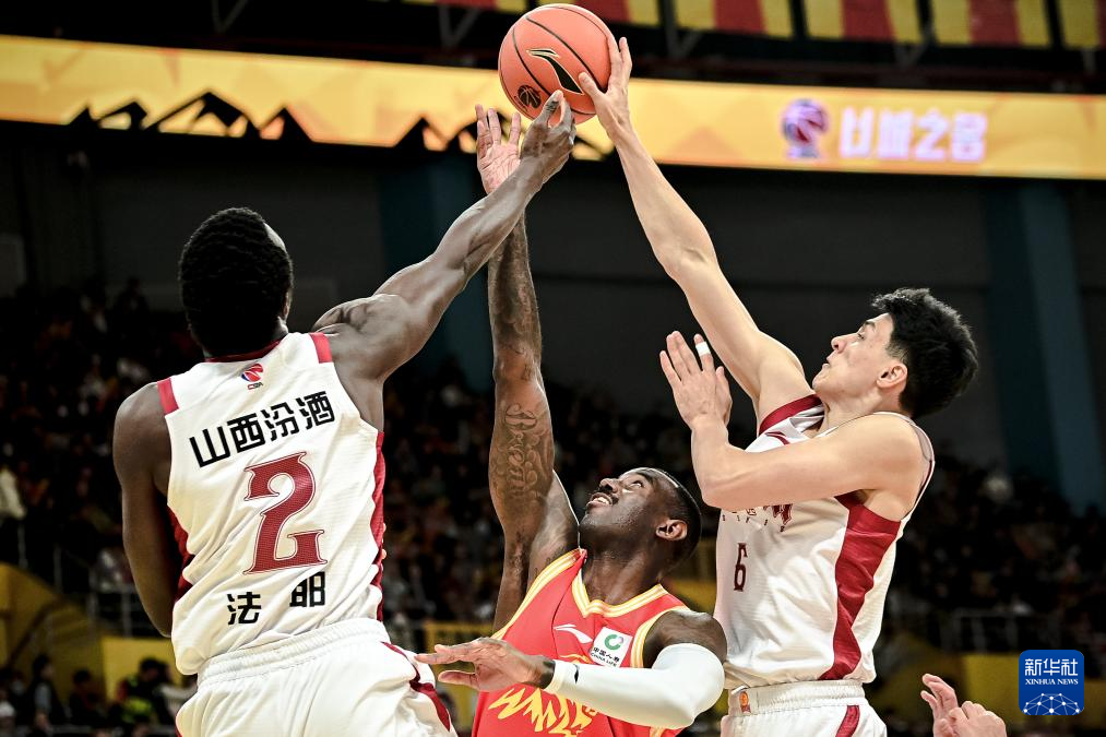 12月12日,山西汾酒队球员法耶(左一)、于米提(右)在比赛中与浙江方兴渡队球员桑普森拼抢篮板球。