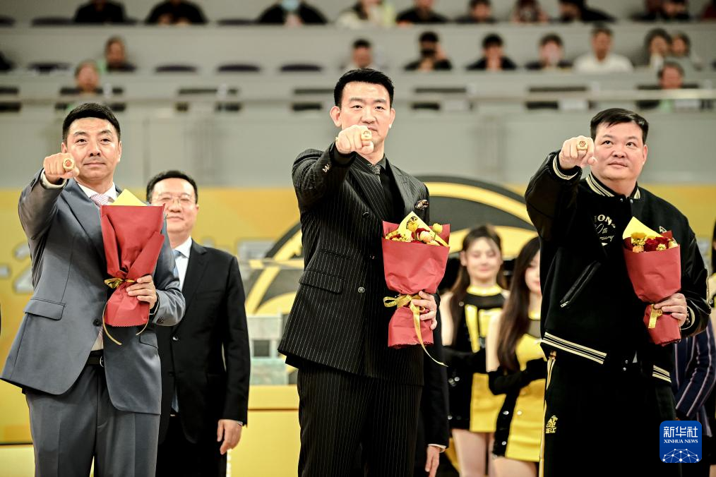 12月12日,浙江方兴渡队主教练王博(中)在赛前仪式上展示总冠军戒指。