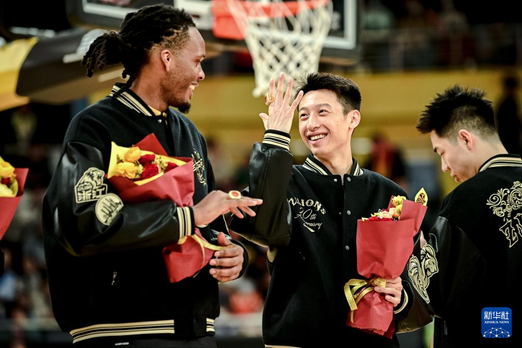 12月12日,浙江方兴渡队球员赵岩昊(右二)在赛前仪式上向队友卡尔顿展示自己的总冠军戒指。