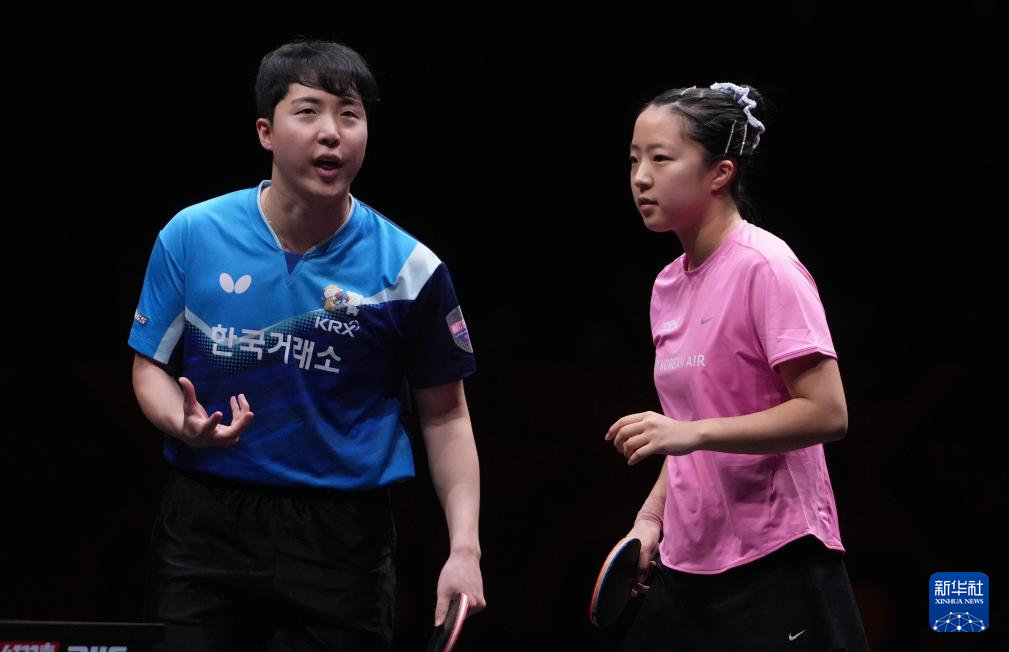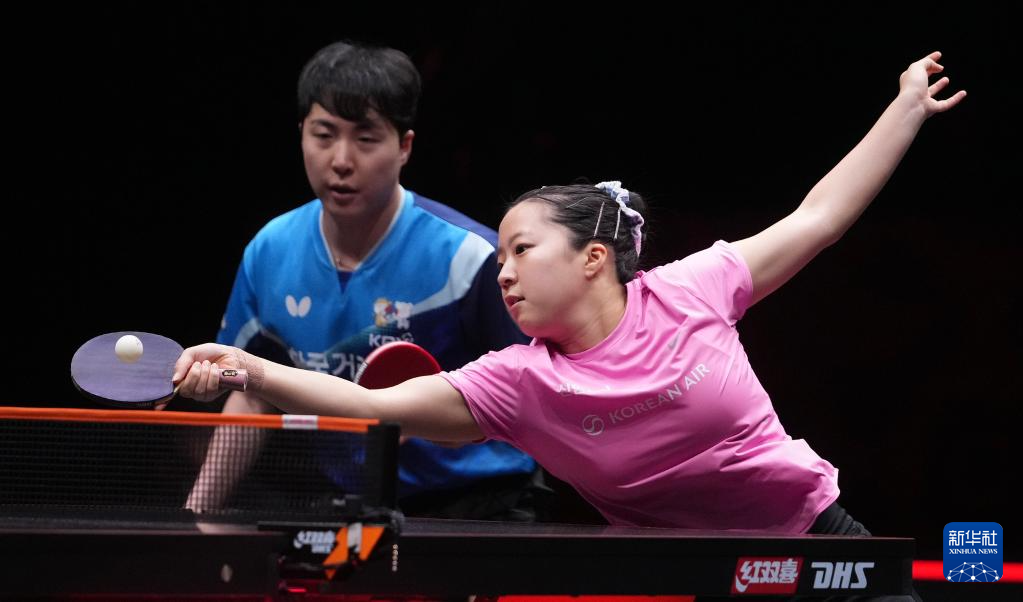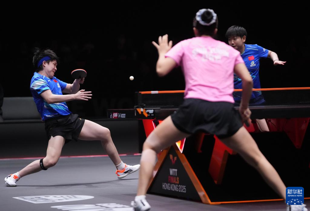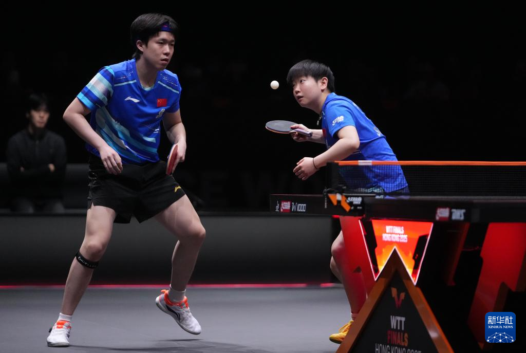 12月13日,王楚钦/孙颖莎(右)在比赛中。