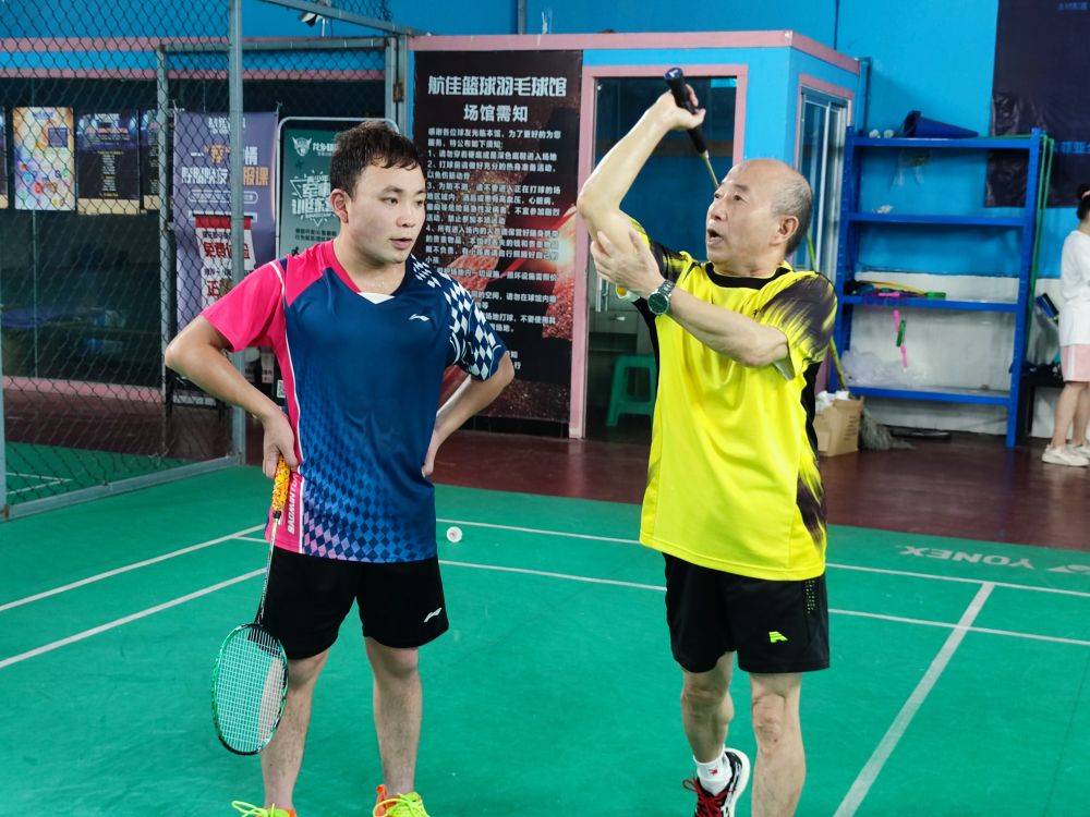黄树阳(右)在指导队员打羽毛球。图片来自受访者