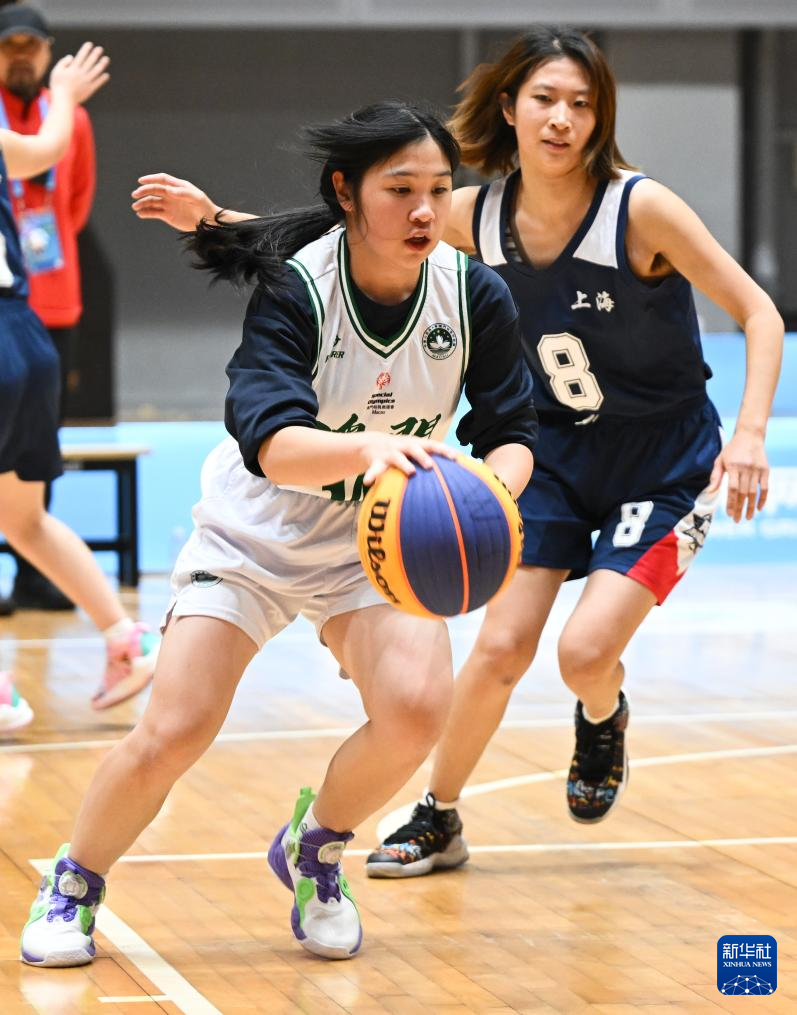 12月14日,澳门一团队球员黄紫君(前)在女子三人篮球决赛B组比赛中带球突破。最终,澳门一团队8比15不敌上海队。