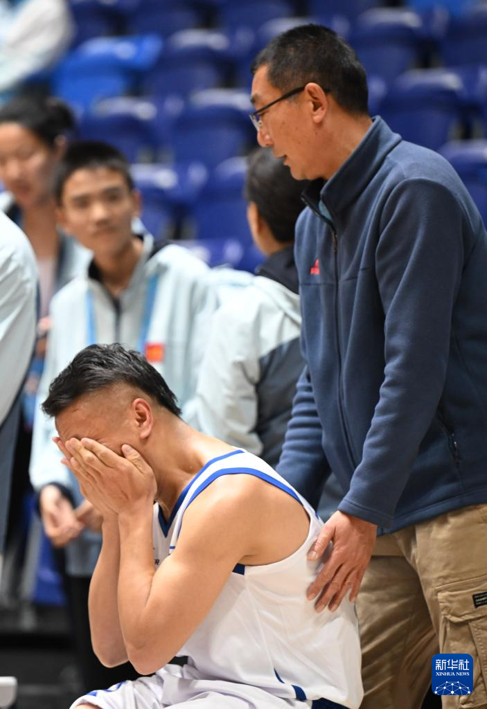 12月14日,山东队教练员在男子组决赛E组比赛后安慰球员王理想(左)。最终,山东队9比14不敌北京队。