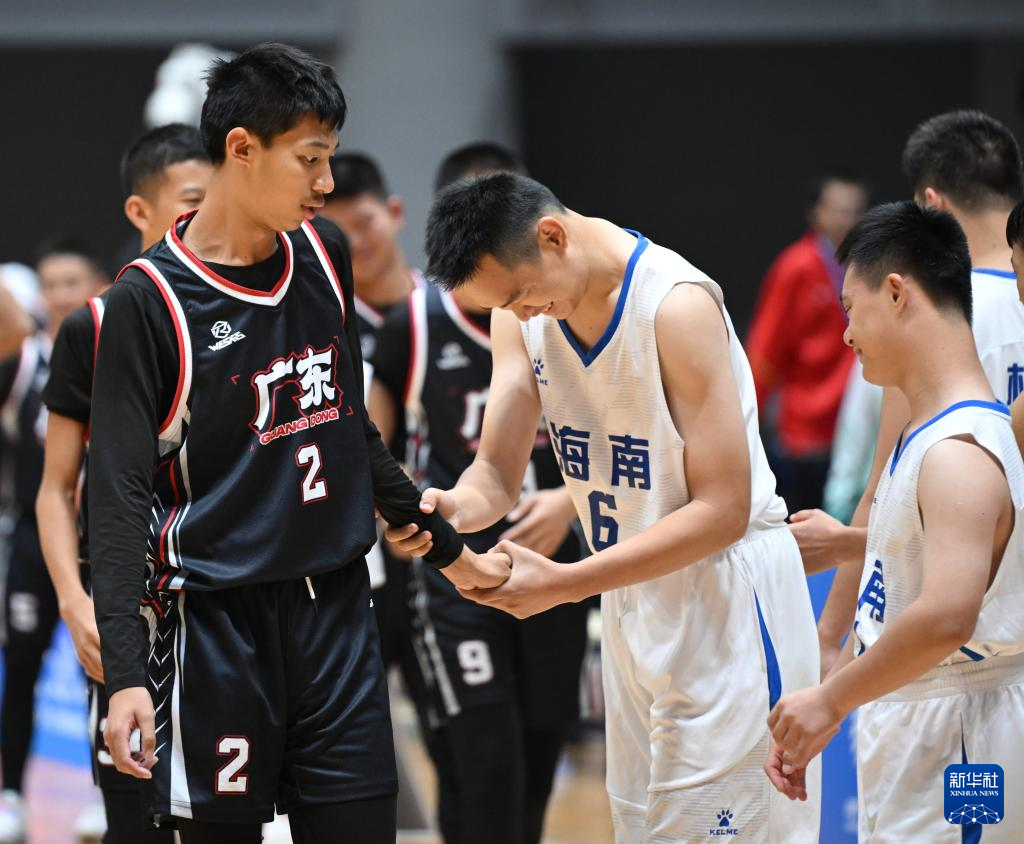 12月14日,广东一团队球员陈昊瑜(前左)在男子组决赛F组比赛后与海南队球员王崇岂(前中)握手致意。最终,广东一团队28比10战胜海南队。