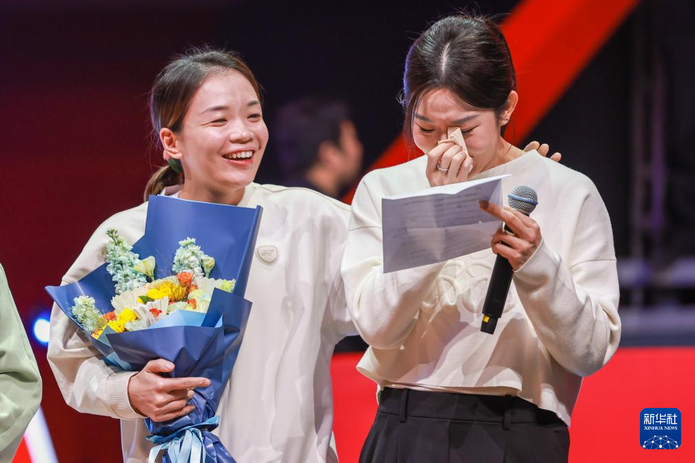 12月21日,中国羽毛球队运动员贾一凡(右)在退役仪式上落泪。