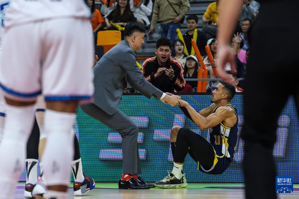 12月21日,广东东阳光队主教练杜锋(左)在比赛中扶起球员奎恩。
