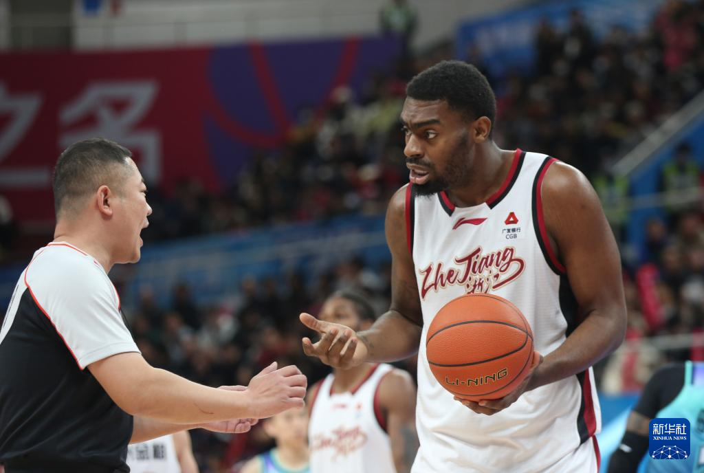 12月26日,浙江稠州金租队球员约翰逊(右)在比赛中与裁判交流。