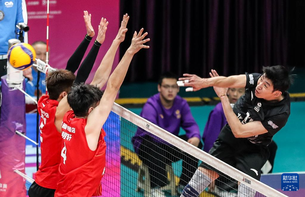 12月28日,北京北汽队球员江川(右)在比赛中扣球。