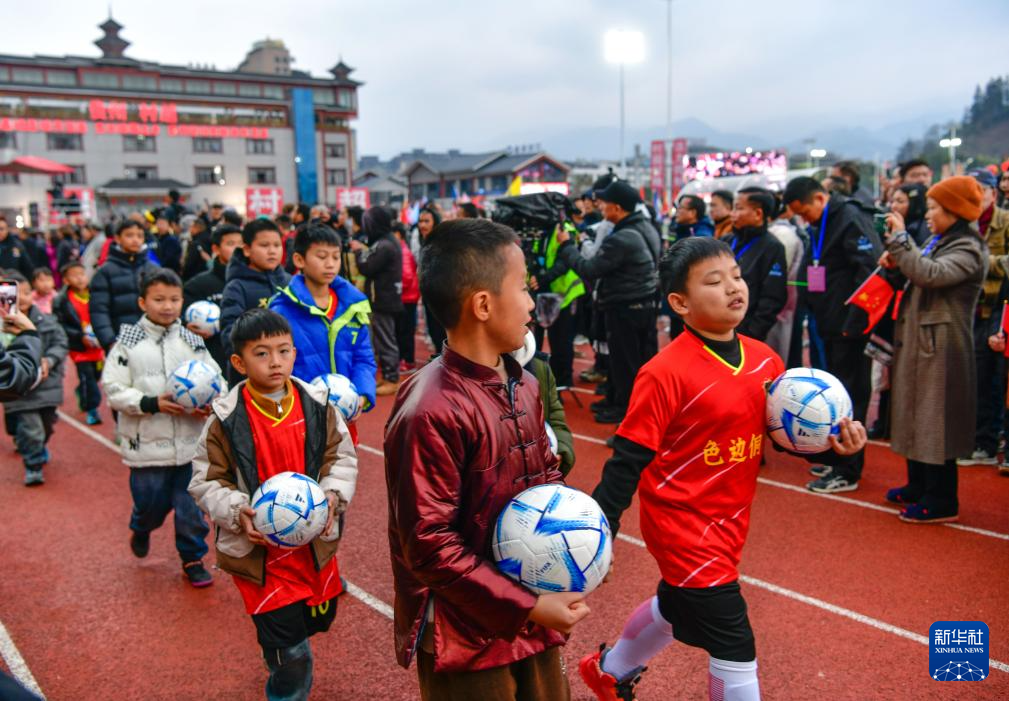 1月2日,孩子们带着足球参加第四届贵州“村超”开幕式巡游。