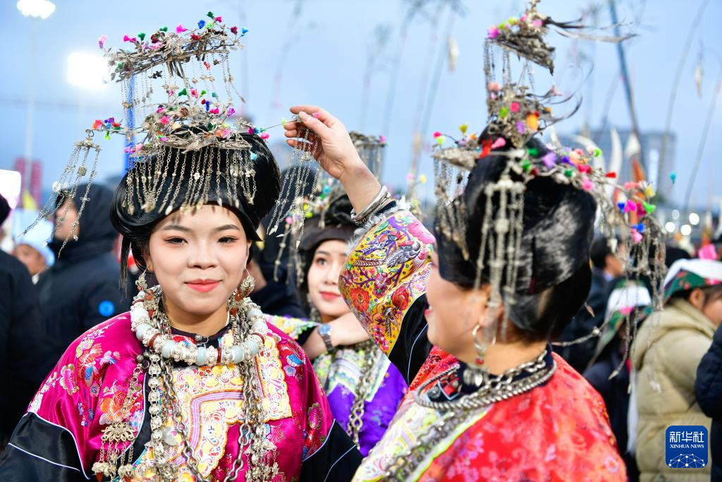1月2日,侗族群众在第四届贵州“村超”开幕式现场整理头饰。