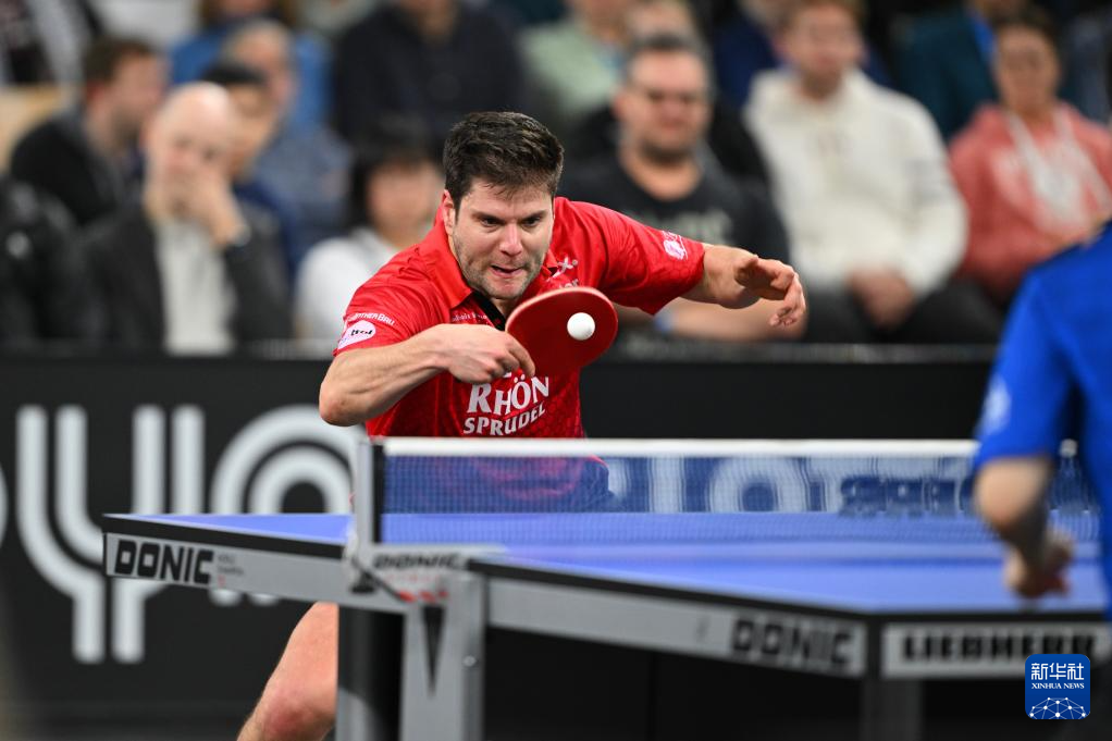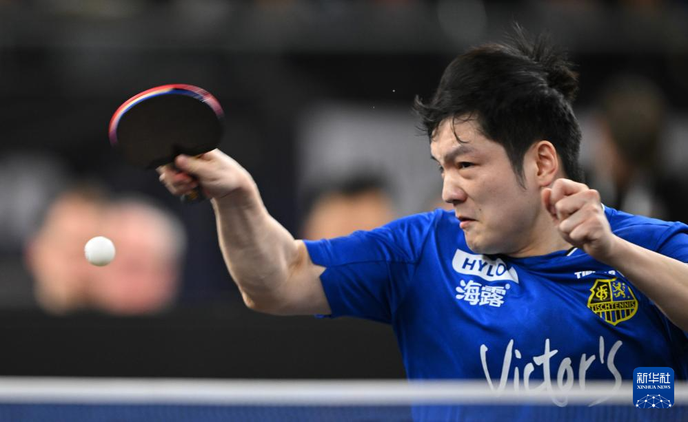 1月4日,萨尔布吕肯队球员樊振东在男子单打比赛中回球。最终他3比0战胜富尔达-马伯策尔队球员奥恰洛夫。