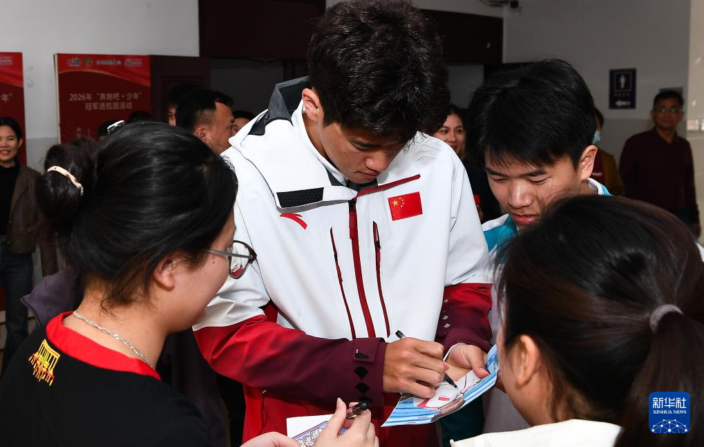 1月5日,潘展乐在活动结束后为学生签名。