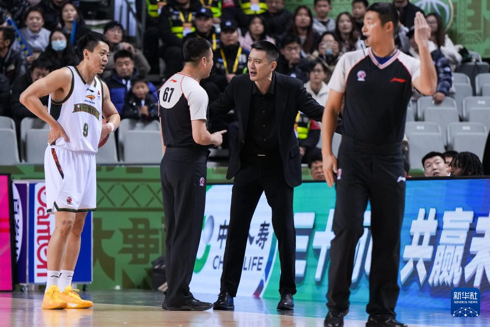 1月6日,辽宁本钢队主教练杨鸣(右二)在比赛中与裁判交流。