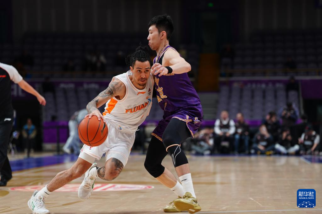 1月12日,福建晋江文旅队球员特莱斯(左)在比赛中突破。