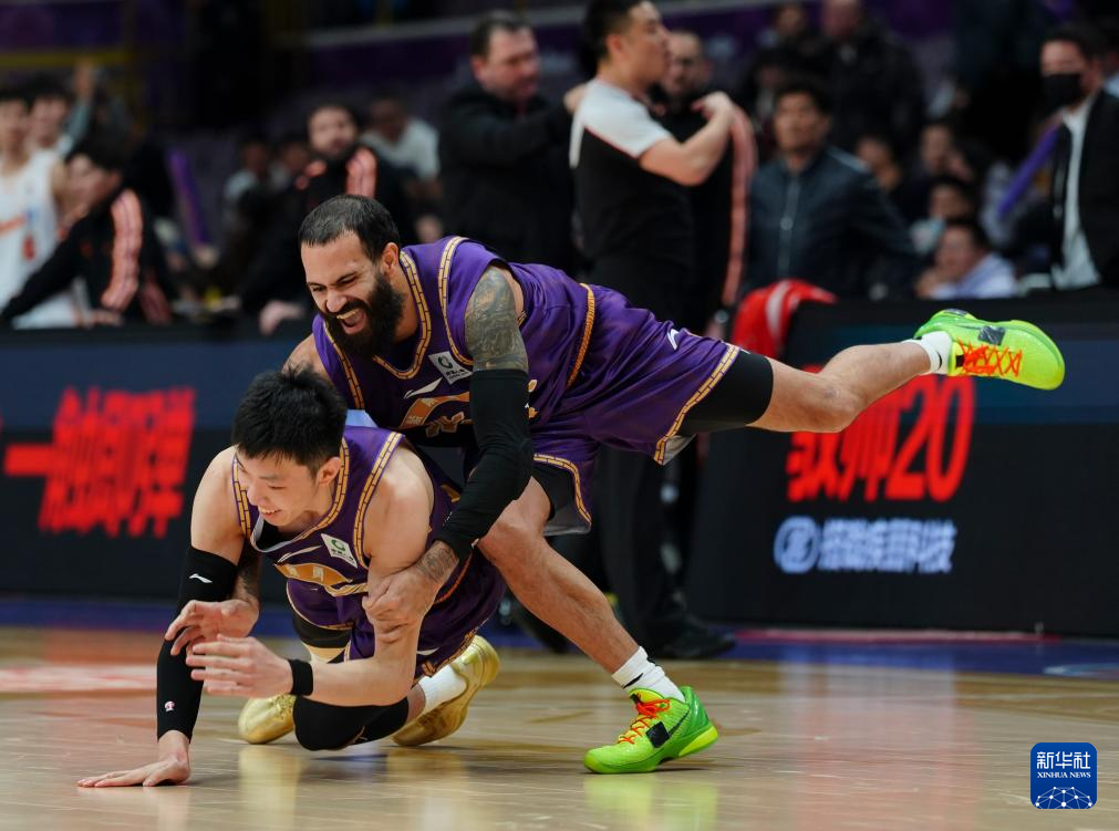 1月12日,北京控股队球员沈梓捷(右)在比赛中庆祝得分。