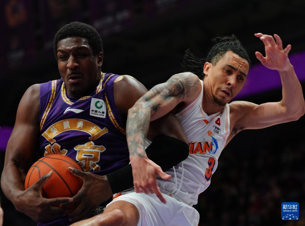 1月12日,北京控股队球员佩里(左)和福建晋江文旅队球员特莱斯在比赛中争抢篮板球。