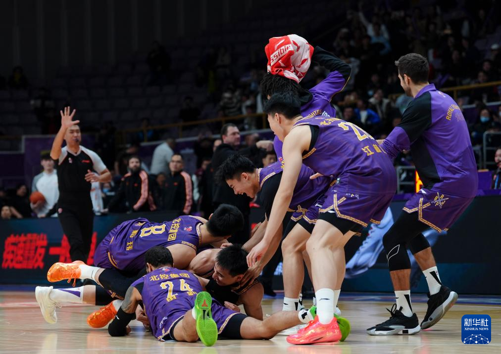 1月12日,北京控股队球员庆祝廖三宁投中绝杀三分球。