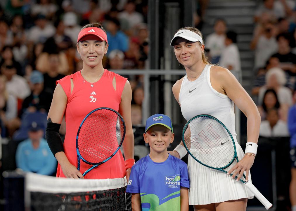 2025年1月12日,王欣瑜 (左)、巴多萨(右)和球童合影。当日,在墨尔本进行的2025年澳大利亚网球公开赛女单首轮比赛中,中国选手王欣瑜0:2不敌西班牙选手巴多萨,无缘下一轮。新华社发(储晨摄)