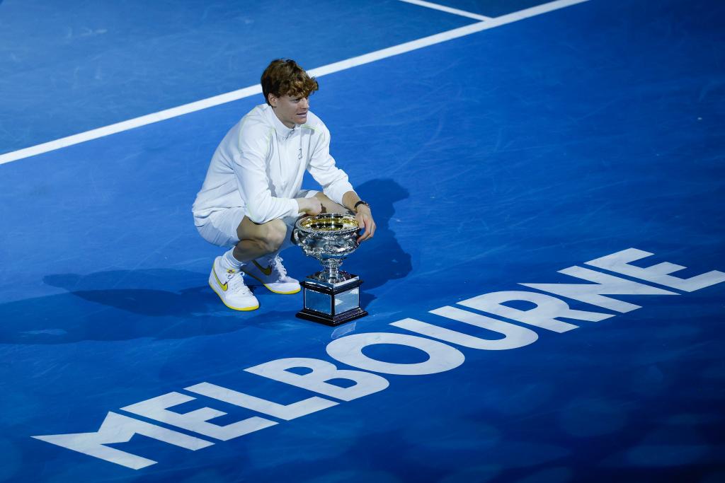 2025年1月26日,辛纳在颁奖仪式上与奖杯合影。当日,在墨尔本进行的2025年澳大利亚网球公开赛男单决赛中,意大利选手辛纳3:0战胜德国选手兹维列夫,夺得冠军。新华社发(储晨摄)