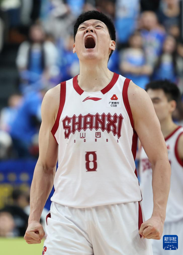 1月16日,山西汾酒队球员张宁在比赛中庆祝投进关键球后庆祝。