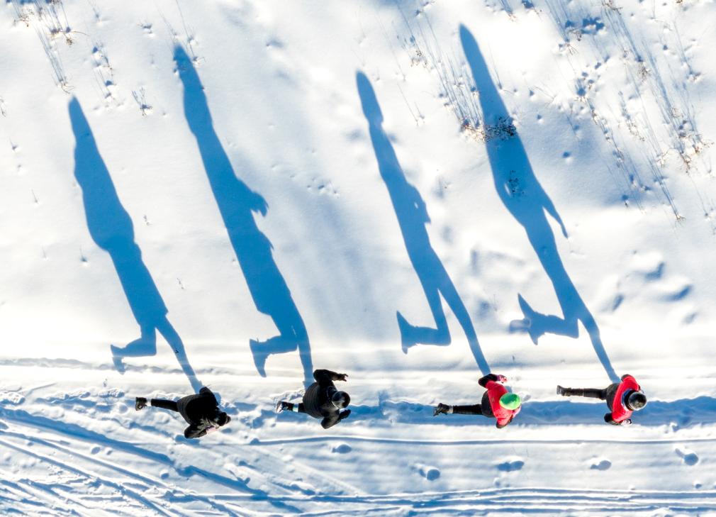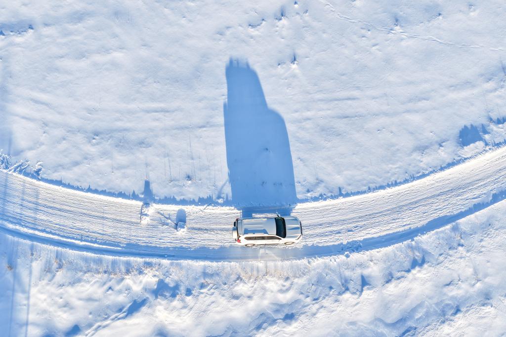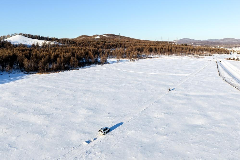 1月14日,在根河市北郊的一处滑雪场,刘斯卫驾驶车辆拉着暖气片压雪道(无人机照片)。新华社记者 连振 摄