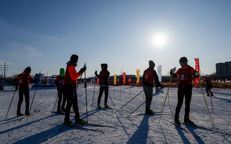 1月16日,在呼伦贝尔海拉尔的越野滑雪比赛场地,队员们在赛前熟悉场地。新华社记者 连振 摄