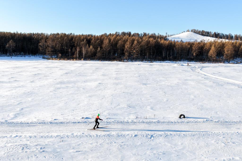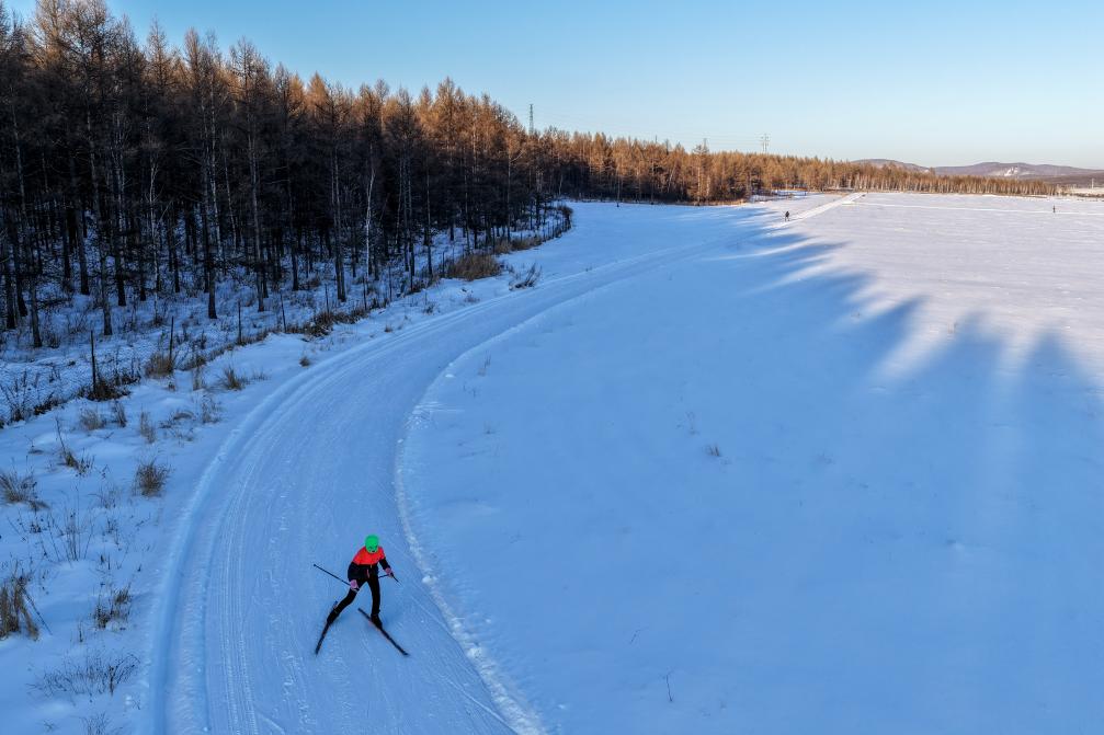 1月14日,在根河市北郊的一处滑雪场,队员娜木娜在进行越野滑雪训练(无人机照片)。新华社记者 连振 摄