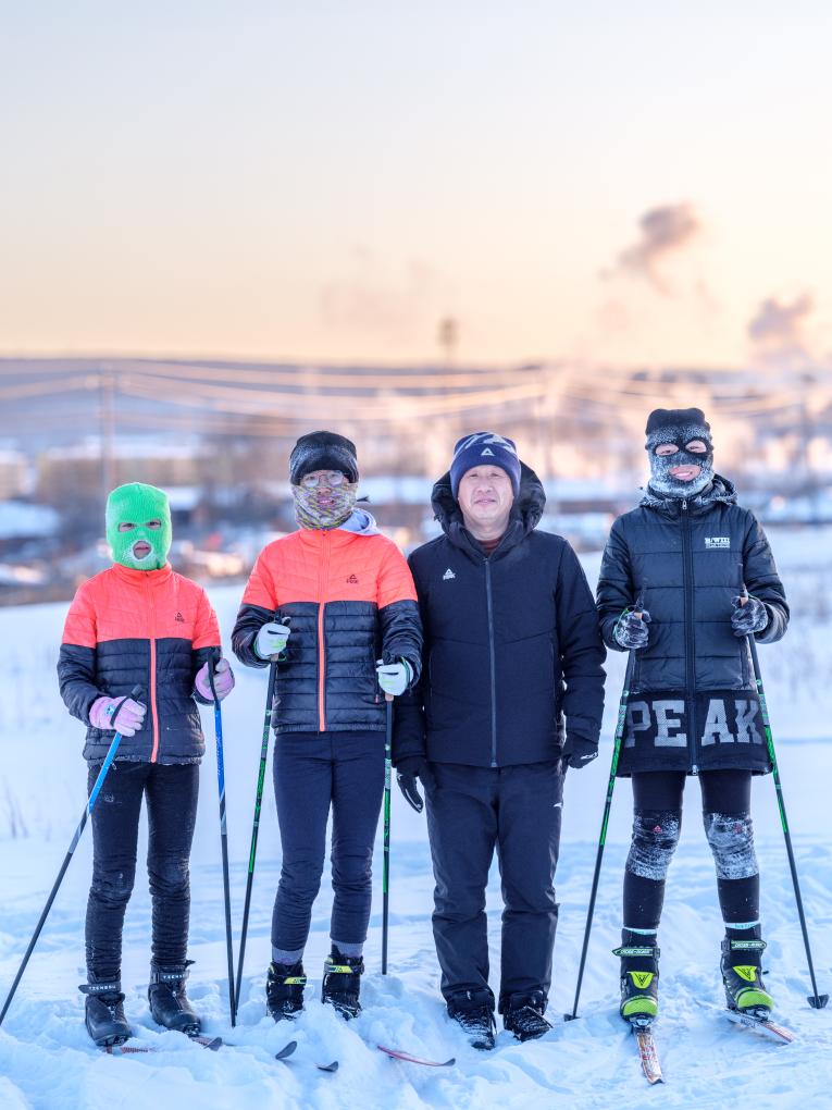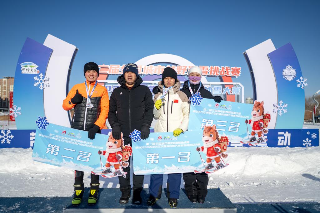 1月17日,在呼伦贝尔海拉尔举办的第二届全国城市越野滑雪挑战赛上,陈春洋(左三)、宗美玲(左一)和教练刘斯卫(左二)在颁奖仪式上合影。新华社记者 连振 摄