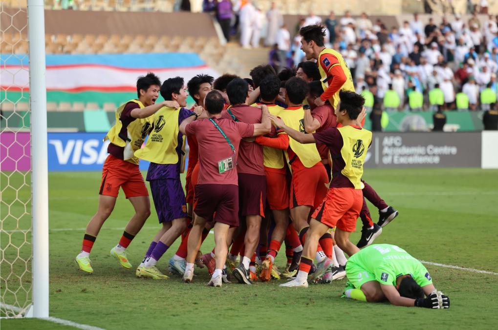 1月17日,中国队在点球大战后庆祝获胜。新华社记者王海洲摄